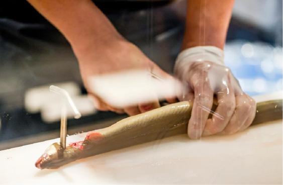 おいしいうなぎの鍵を握るのは、なにより鮮度。素材の旨みを最大級に引き出すため、私たちは徹底的な品質管理を行います。それぞれの店舗で捌いた、ふわっと柔らかな食感。それは、新鮮なうなぎの証しです。
